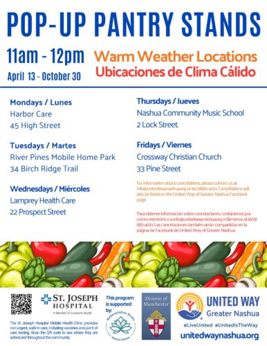 NASHUA – Beginning the week of April 13, the Pop-Up Pantries, organized by the United Way of Greater Nashua, will transition back to outdoor locations for the spring and summer months.
