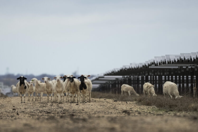 BUCKHOLTS, Texas (AP) — On rural Texas farmland, beneath hundreds of rows of solar panels, a troop of stocky sheep rummage through pasture, casually bumping into one another as they remain committed to a single task: chewing grass.