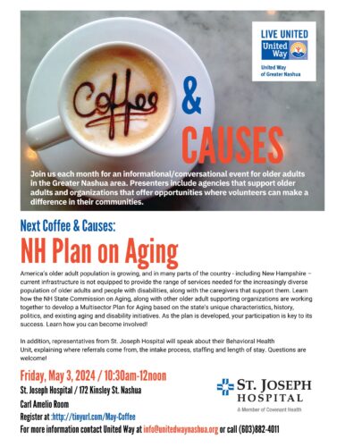 NASHUA - The United Way of Greater Boston will be hosting its next Coffee and Causes talk for older adults on May 3 at St. Joseph Hospital, 172 Kinsley St. in Nashua.