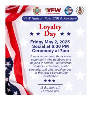 HUDSON - The Hudson VFW Post 5791 will hold its Loyalty Day Ceremony on May 2 at 7 p.m. at 15 Bockes Rd.