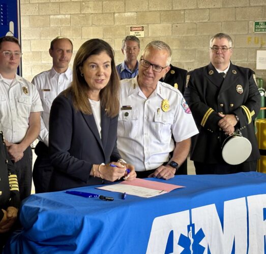 NASHUA - Gov. Kelly Ayotte recently joined first responders at the American Medical Response building to sign Senate Bill 245 into law, which will shield residents from surprise ambulance bills and control the reimbursement of medical transportation expenses.