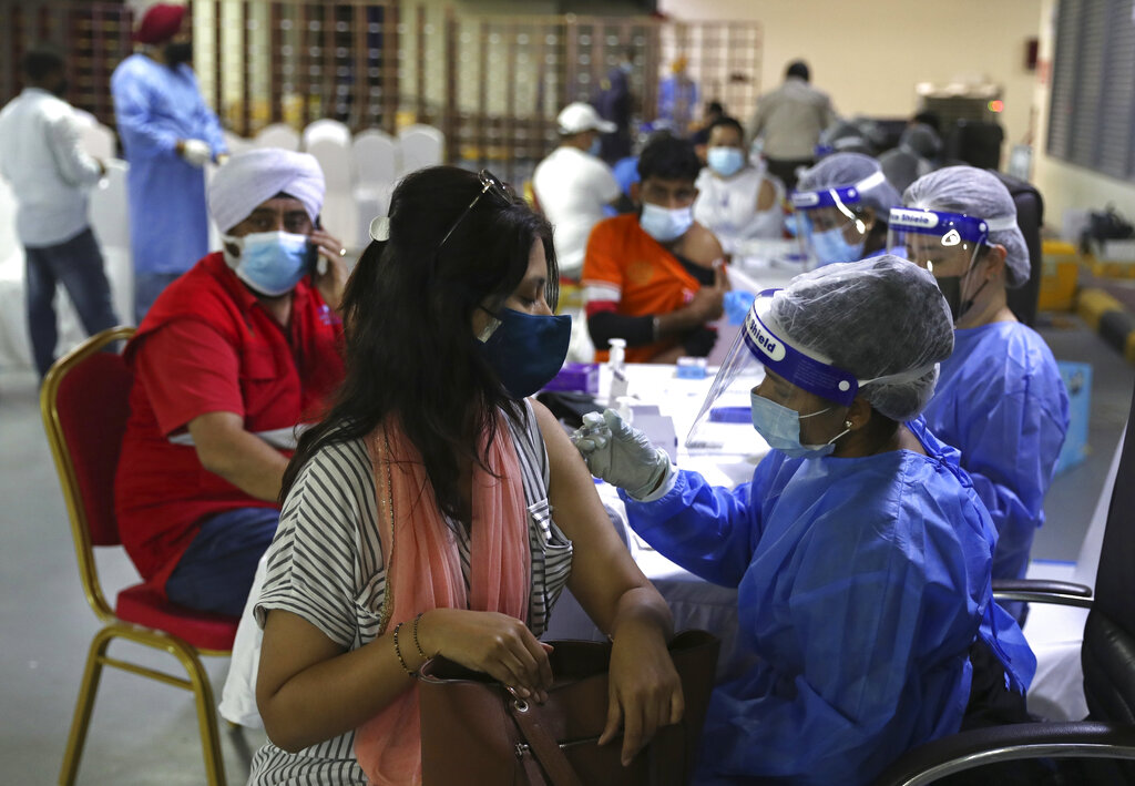 FILE - A woman receives a Sinopharm COVID-19 vaccine from a medical staffer at the Guru Nanak Darbar Sikh Temple, in Dubai, United Arab Emirates, Monday, Feb. 8, 2021. The emirate of Ajman is warning its government employees that they will be penalized for coming into contact for a second time with anyone who has contracted COVID-19, state-linked media in the UAE reported Thursday, Jan. 13, 2021. The UAE has a vaccination rate of 99% among eligible residents and a total death toll of under 2,200 from the virus, but the spread of the omicron variant globally has pushed the number of daily infections up. (AP Photo/Kamran Jebreili, File)