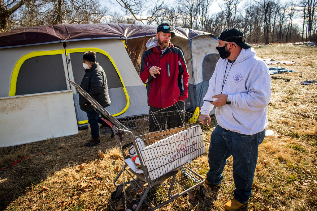 As the couple’s dog yapped and whined away, Daugharthy unzipped the front flap of the tent where they live behind the Southern States Frederick Co-op on East South Street. He stepped out into the chilly air, cigarette dangling from his fingers, and offered handshakes to each of the outreach workers standing before him.