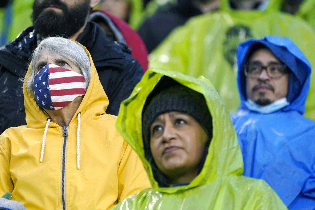 FILE - A person wears a U.S. flag face mask during the national anthem before an MLS soccer match between the Seattle Sounders and Nashville SC, Feb. 27, 2022, in Seattle. Many Americans are significantly relaxing how often they wear masks and take other once-routine precautions against the coronavirus. A new poll from The Associated Press-NORC Center for Public Affairs Research shows fewer than half now say they regularly wear face masks, avoid crowds and skip nonessential travel. Americans are letting their guard down as new COVID-19 infections plummet to their lowest level since July. (AP Photo/Ted S. Warren, File)