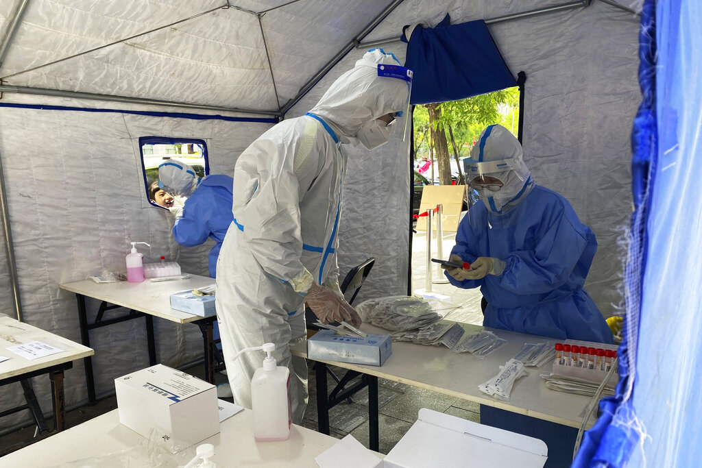 Workers in protective overalls conduct mass COVID testing for residents on Wednesday, May 11, 2022, in Beijing. (AP Photo/Ng Han Guan)
