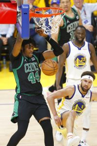 - Boston Celtics center Robert Williams III (44) dunks against the Golden State Warriors during the second half of Game 5 of basketball’s NBA Finals in San Francisco, Monday, June 13, 2022. (AP Photo/John Hefti)