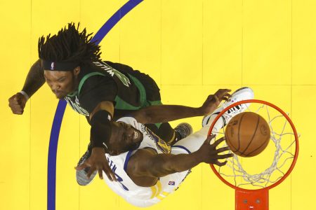 - Golden State Warriors forward Draymond Green, bottom, dunks against Boston Celtics center Robert Williams III during the first half of Game 5 of basketball’s NBA Finals in San Francisco, Monday, June 13, 2022. (Ezra Shaw/Pool Photo via AP)