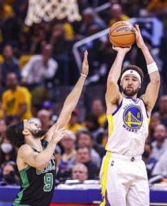 - Golden State Warriors’ Klay Thompson, 11, shoots over Boston Celtics’ Derrick White, 9, during the second quarter in Game 5 of the NBA Finals at Chase Center in San Francisco on Monday, June 13, 2022. (Scott Strazzante/San Francisco Chronicle via AP)