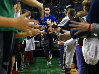 - Golden State Warriors’ Stephen Curry runs through Boston Celtics’ fans before Warriors 124-119 double overtime win in NBA game at TD Garden in Boston, Massachusetts on Friday, December 11, 2015. (Scott Strazzante/San Francisco Chronicle via AP)