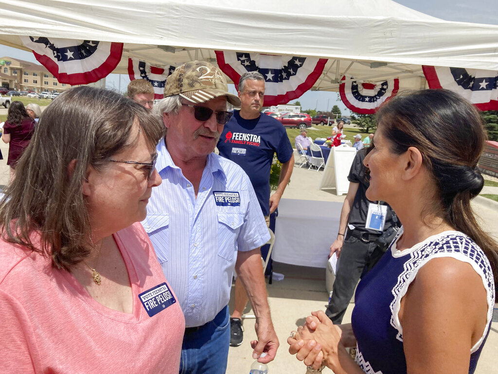 Former United Nations Ambassador Nikki Haley talks with Bob and Kathy de Koning, a farming couple from Sioux County, Iowa, Thursday, June 30, 2022, after headlining a fundraiser in northwest Iowa for Republican Rep. Randy Feenstra. (AP Photo/Tom Beaumont)