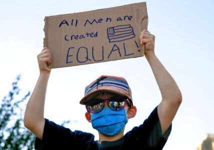- FILE – A boy holds a sign saying “All men are created equal,” as he attends a protest on June 7, 2020, near the White House in Washington, over the death of George Floyd, a black man who was in police custody in Minneapolis. “All men are created equal.” Few words in American history are invoked as often as the preamble to the Declaration of Independence, published nearly 250 years ago, and few more difficult to define. (AP Photo/Jacquelyn Martin, File)