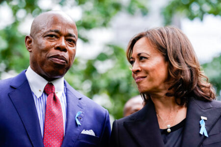 Vice President Kamala Harris speaks to New York City mayor Eric Adams at the ceremony to commemorate the 21st anniversary of the Sept. 11 terrorist attacks, Sunday, Sept. 11, 2022, at the National September 11 Memorial & Museum in New York. (AP Photo/Julia Nikhinson)