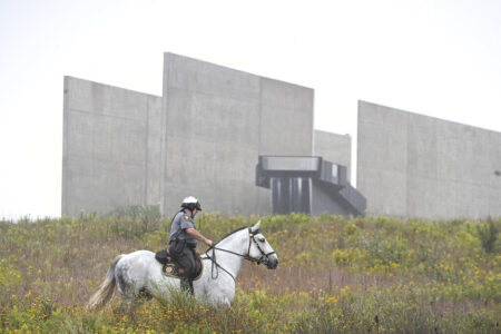 Pennsylvania mounted police officers stand in a field over looking the Wall of Names before a ceremony commemorating the 21st anniversary of the Sept. 11, 2001 terrorist attacks at the Flight 93 National Memorial in Shanksville, Pa., Sunday, Sept. 11, 2022. (AP Photo/Barry Reeger)