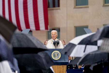 President Joe Biden speaks during a ceremony at the Pentagon in Washington, Sunday, Sept. 11, 2022, to honor and remember the victims of the September 11th terror attack. (AP Photo/Andrew Harnik)