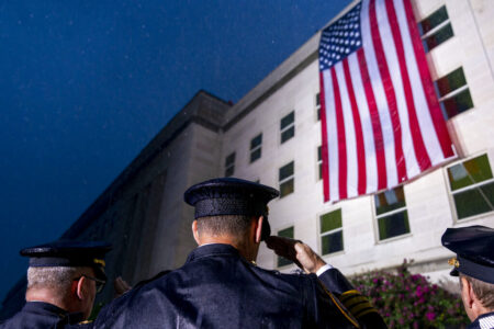 First responders salute as a U.S. flag is unfurled at the Pentagon in Washington, Sunday, Sept. 11, 2022, at sunrise on the morning of the 21st anniversary of the 9/11 terrorist attacks. (AP Photo/Andrew Harnik)