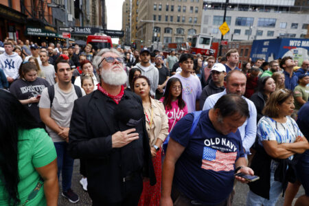 People gather on Cedar Street by the perimeter of the commemoration ceremony during a moment of silence on the 21st anniversary of the September 11, 2001 terror attacks on Sunday, Sept. 11, 2022 in New York. (AP Photo/Stefan Jeremiah)