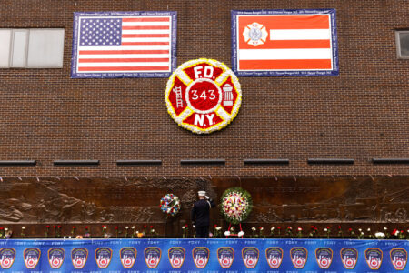 A firefighter salutes outside the FDNY Engine 10, Ladder 10 fire station near the commemoration ceremony on the 21st anniversary of the September 11, 2001, terror attacks on Sunday, Sept. 11, 2022, in New York. (AP Photo/Julia Nikhinson)