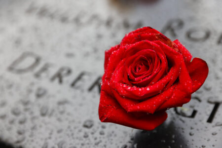 A rose at the reflecting pool during the commemoration ceremony on the 21st anniversary of the September 11, 2001 terror attacks on Sunday, Sept. 11, 2022 in New York. (AP Photo/Stefan Jeremiah)