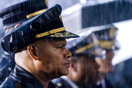 First responders stand in a driving rain as a U.S. flag is unfurled at the Pentagon in Washington, Sunday, Sept. 11, 2022, at sunrise on the morning of the 21st anniversary of the 9/11 terrorist attacks. (AP Photo/Andrew Harnik)
