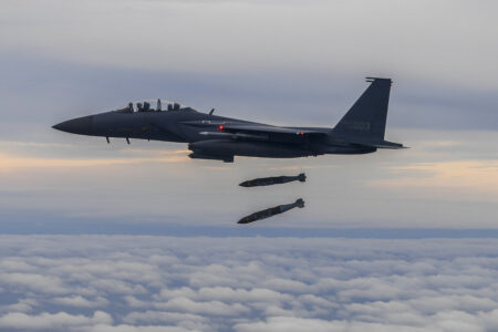 - In this photo provided by South Korea Defense Ministry, South Korean Air Force’s F15K fighter jet fires 2 JDAM (Joint Direct Attack Munition ) bombs into an island target in South Korea, Tuesday, Oct. 4, 2022. The South Korean and U.S. militaries responded to a North Korea morning missile launch by launching fighter jets which fired weapons at a target off South Korea’s west coast in a show of strength against North Korea. (South Korea Defense Ministry via AP)