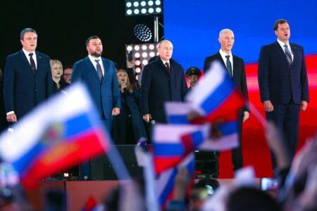 - FILE – Russian President Vladimir Putin, center, speaks as Leonid Pasechnik, leader of self-proclaimed Luhansk People’s Republic, left, Denis Pushilin, leader of self-proclaimed of the Donetsk People’s Republic, second left, Moscow-appointed head of Kherson Region Vladimir Saldo, second right, and Moscow-appointed head of Zaporizhzhia region Yevgeny Balitsky, right, stand near him during celebrations marking the incorporation of regions of Ukraine to join Russia in Red Square in Moscow, Russia, Friday, Sept. 30, 2022. The signing of the treaties making the four regions part of Russia follows the completion of the Kremlin-orchestrated “referendums.” (Sergei Karpukhin, Sputnik, Kremlin Pool Photo via AP, File)