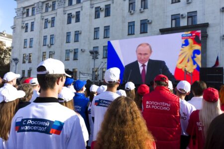 - FILE – People watch Russian President Vladimir Putin’s address as they gather during celebrations marking the incorporation of the Luhansk region into Russia in Luhansk, Ukraine, Friday, Sept. 30, 2022. The signing of the treaties making the four regions part of Russia follows the completion of the Kremlin-orchestrated “referendums.” Words on their ti-shorts are reading “Volunteers for Russia, With Russia forever!”. (AP Photo, File)