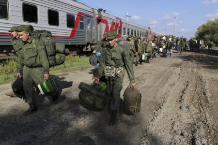 - FILE – Russian recruits walk to take a train at a railway station in Prudboi, Volgograd region of Russia, Thursday, Sept. 29, 2022. Russian President Vladimir Putin has ordered a partial mobilization of reservists to beef up his forces in Ukraine. With the Russian army retreating under the blows of Ukrainian forces armed with Western weapons, Putin raised the stakes by annexing four Ukrainian regions and declaring a partial mobilization of up to 300,000 reservists to buttress the crumbling frontline. (AP Photo, File)