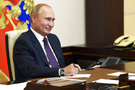 - FILE – Russian President Vladimir Putin smiles as he attends a meeting via video conference at the Novo-Ogaryovo residence outside Moscow, Russia, Thursday, Aug. 20, 2020. With his room for maneuver narrowing quickly amid Russian military defeats in Ukraine, Putin has signaled that he could resort to nuclear weapons to protect the Russian gains in Ukraine – the harrowing rhetoric that shattered a mantra of stability he has repeated throughout his 22-year rule. (Alexei Nikolsky, Sputnik, Kremlin Pool Photo via AP, File)