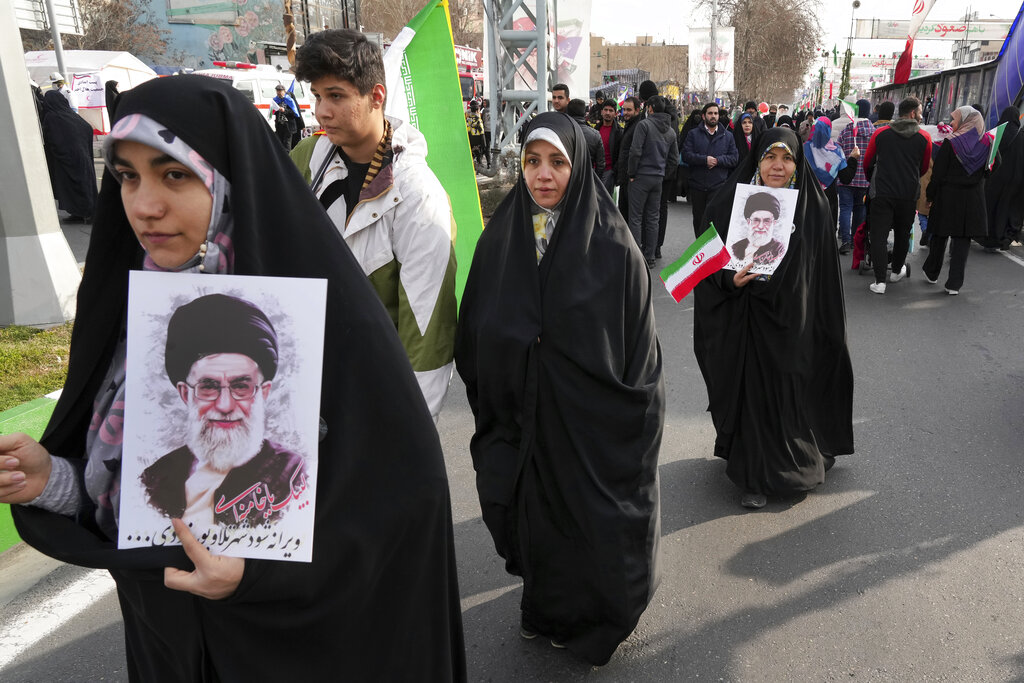 Iranian demonstrators carry posters of the Supreme Leader Ayatollah Ali Khamenei and their national flag during the annual rally commemorating Iran's 1979 Islamic Revolution, in Tehran, Iran, Saturday, Feb. 11, 2023. Iran on Saturday celebrated the 44th anniversary of the 1979 Islamic Revolution amid nationwide anti-government protests and heightened tensions with the West. (AP Photo/Vahid Salemi)