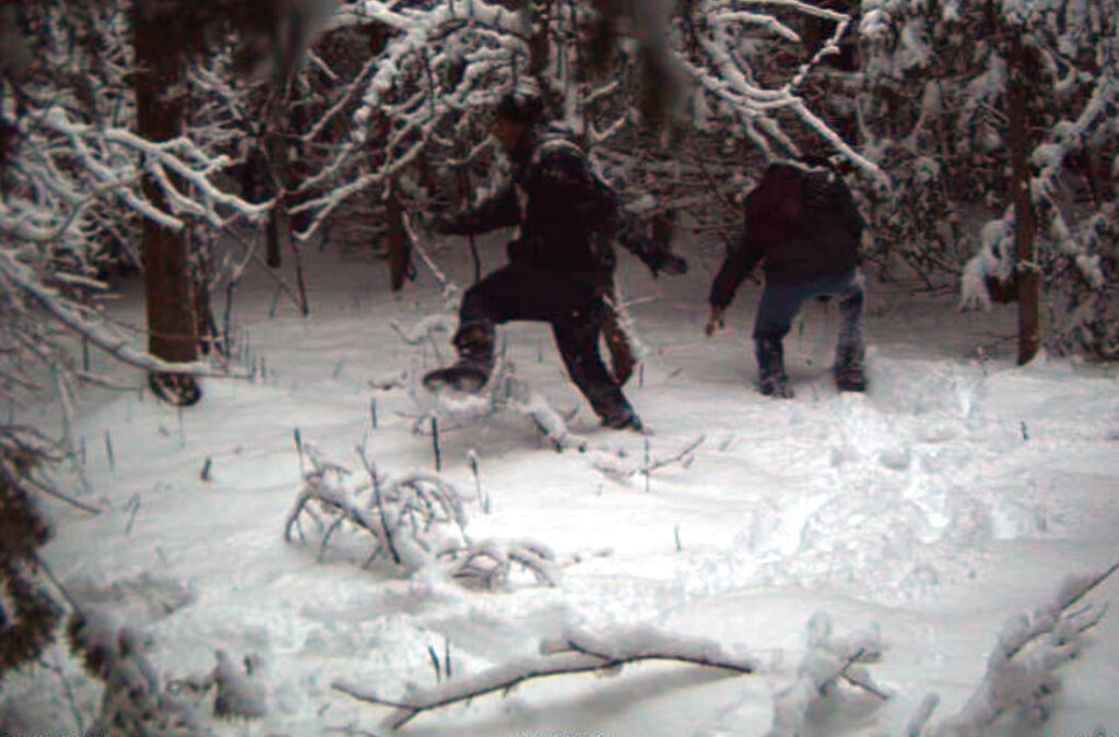 FILE - In this surveillance image provided by the United States Border Patrol Swanton sector, two individuals illegally cross the US/Canada border in January 2023 at the Vermont, New Hampshire and New York enforcement sector. Federal authorities have added 25 border patrol agents at a section of the northeastern U.S. border with Quebec in response to a spike in illegal crossings. The team started on Monday, March 6, 2023. (United States Border Patrol Swanton sector photo via AP, File)
