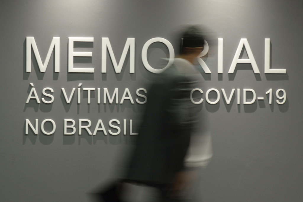 FILE - A man walks past a wall that reads in Portuguese "Memorial to the victims of COVID-19 in Brazil," in the Senate building in Brasilia, Brazil, Tuesday, Feb. 15, 2022. Brazil has officially recorded its 700,000th death from COVID-19, on Tuesday, March 28, 2023. (AP Photo/Claudio Reis, File)