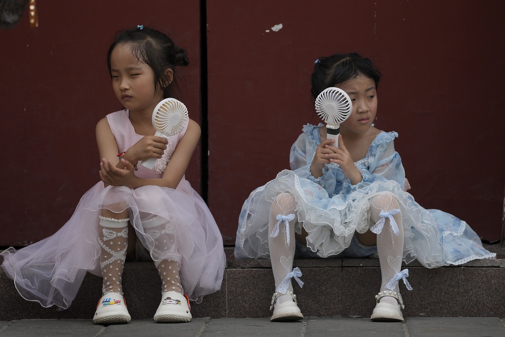 FILE - Children cool themselves with electric fans as they take a rest near the Forbidden City on a hot day in Beijing, June 25, 2023. The National Oceanic and Atmospheric Administration said Thursday, July 13, an already warming Earth steamed to its hottest June on record. (AP Photo/Andy Wong, File)