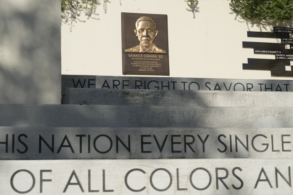 Words decorate the concrete steps up to a bronze plate with the likeness of former President Barack Obama at the Plaza where then student Obama made his first political speech "A Protest against Apartheid" on Feb. 18, 1981, at Occidental College in Los Angeles, seen on Thursday, July 27, 2023. Occidental College is the latest school to end legacy admissions in the wake of a Supreme Court decision removing race from admissions decisions. (AP Photo/Damian Dovarganes)