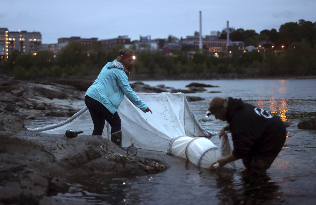 FILE - Elver fishermen set up a net on the Penobscot River in Brewer, Maine, on May 25, 2017. Fishermen who harvest one of the most valuable aquatic species in the country are hopeful regulators will allow more harvest in the tightly controlled eel fishing industry. (AP Photo/Robert F. Bukaty, File)