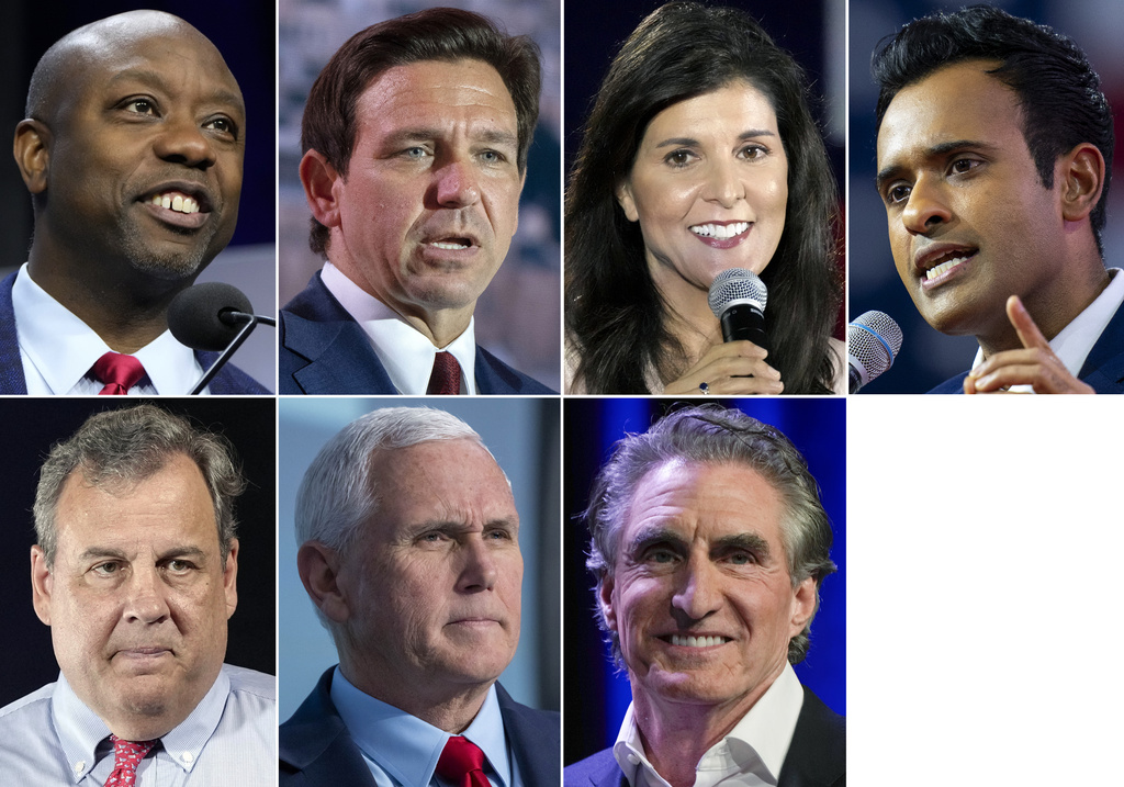 This combination of photos shows Republican presidential candidates, top row from left, Sen. Tim Scott, R-S.C., Florida Gov. Ron DeSantis, former South Carolina Gov. Nikki Haley, and Vivek Ramaswamy, bottom row from left, former New Jersey Gov. Chris Christie, former Vice President Mike Pence and North Dakota Gov. Doug Burgum. (AP Photo)