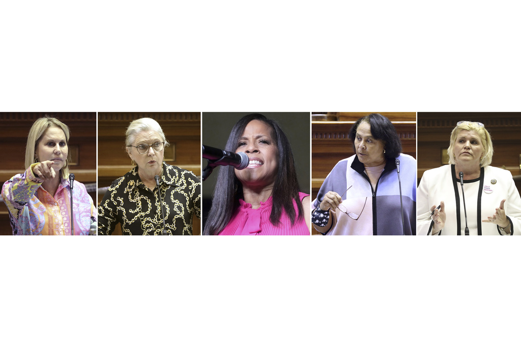 In this combo image, South Carolina senators from left; State Sen. Sandy Senn on Sept. 7, 2022, in Columbia, S.C., Sen. Katrina Shealy on Sept. 7, 2022, in Columbia, S.C. State Sen. Mia McLeod on June 11, 2022, in Columbia, S.C., State Sen. Margie Bright Matthews on Jan. 28, 2021, Columbia, S.C., and Penry Gustafson on May 23, 2023. The five women Senators from South Carolina — who formed a bipartisan coalition to filibuster a near-total abortion ban in their state have been chosen to receive the John F. Kennedy Profile in Courage Award this year. (AP Photo/Jeffery Collins, Meg Kinnard, File)