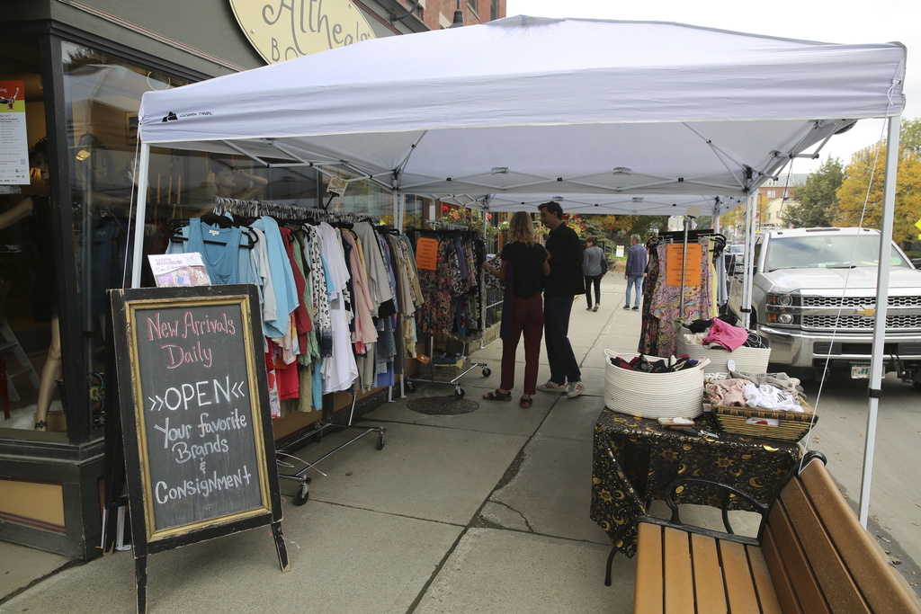 Shoppers stop at a sidewalk sale at Althea's Attic Boutique in Montpelier, Vt., on Friday, Oct. 6, 2023. Three months after flooding inundated the small city, Montpelier is holding a reopening celebration on Friday and Saturday to show the progress. (AP Photo/Lisa Rathke)