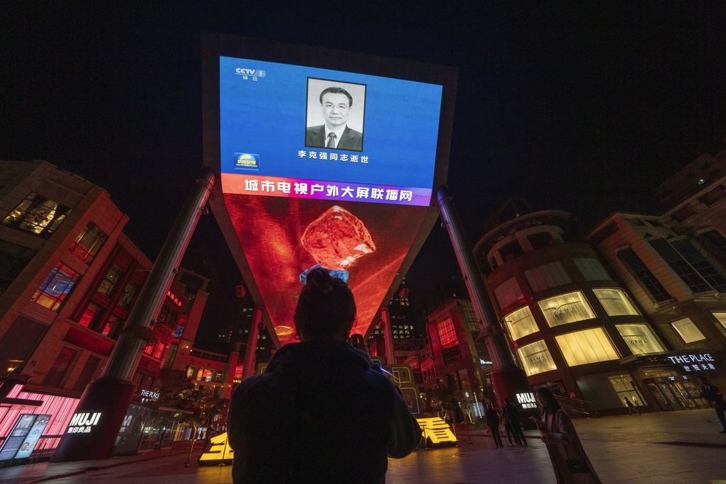 The evening news broadcast shows an obituary photo of the former Premier Li Keqiang on a giant LED screen in Beijing, Friday, Oct. 27, 2023. The sudden death of China's former second-ranking leader, Li Keqiang, has shocked many people in the country, with tributes offered up to the ex-official who promised market-oriented reforms but was politically sidelined. (AP Photo/Ng Han Guan)