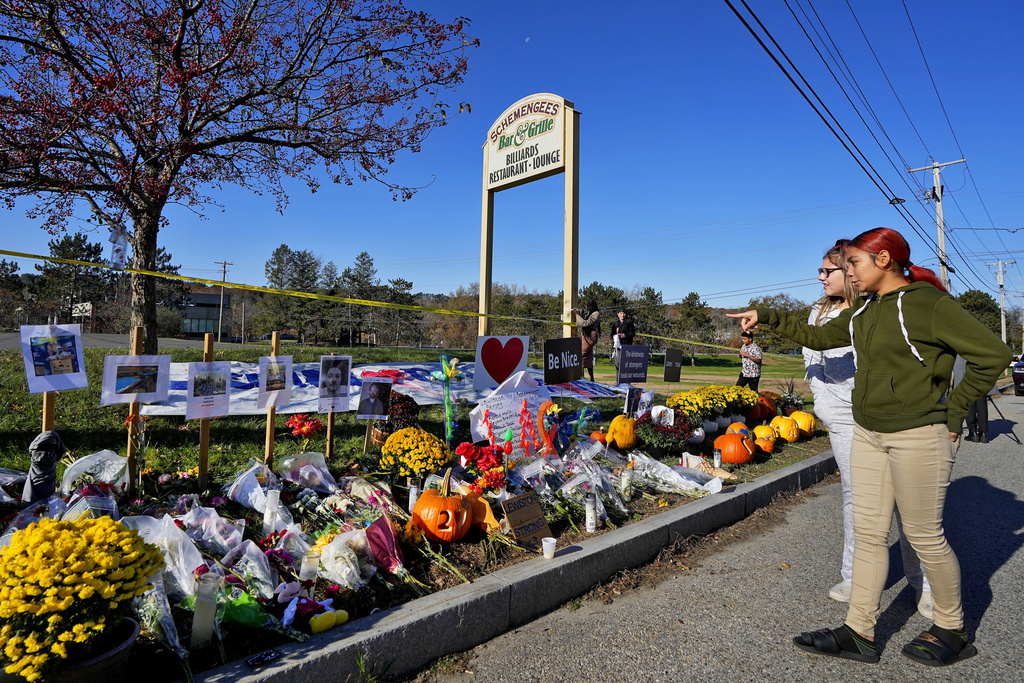 FILE - Community members look at a memorial outside Schemengees Bar & Grille, Friday, Nov. 3, 2023, Lewiston, Maine. Months after a deadly mass shooting in Maine, backers and detractors held an hourslong debate over a so-called red flag bill. The measure discussed on Friday, April 5, 2024, would let family members petition a judge to remove guns from someone experiencing a psychiatric crisis. (AP Photo/Matt York, File)