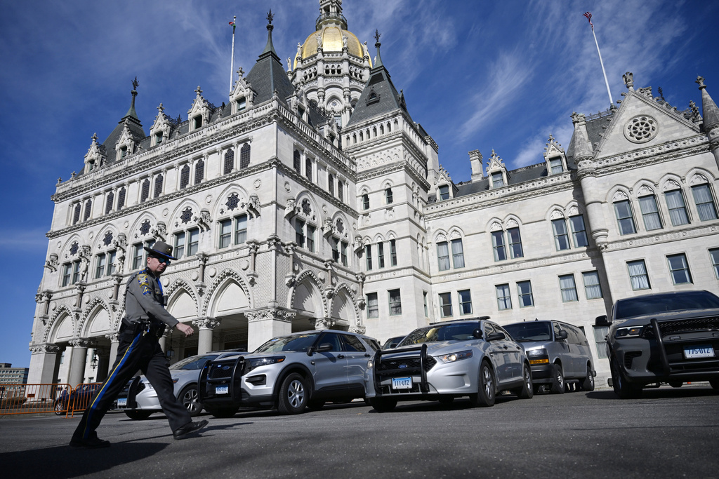 FILE - Police vehicles are stationed outside the Connecticut State Capitol on the opening session of legislature, Feb. 7, 2024, in Hartford, Conn. Facing a Dec. 31 deadline, Connecticut lawmakers were on track Tuesday, May, 7, 2024, to approve a Democratic plan to spend at least $360 million in remaining federal COVID-19 pandemic funds on key areas, including higher education, not-for-profit social service agencies, municipal aid and children's mental health. (AP Photo/Jessica Hill, File)