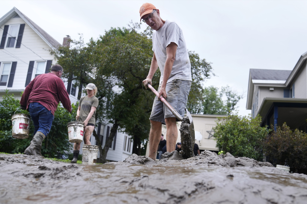 Homeowner Scott Mackie, right, shovels mud away from his home while cleaning up the remnants of Hurricane Beryl, Thursday, July 11, 2024, in Waterbury, Vt. Mackie said his basement was filled with nearly five feet of the muddy mixture, which friends and neighbors are helping to empty. (AP Photo/Charles Krupa)