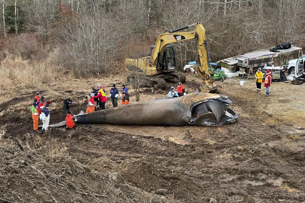 This image provided by NOAA Fisheries shows scientists and researchers performing a necropsy on a North Atlantic right whale, which was found dead off Joseph Sylvia State Beach in January 2024, on Feb. 2, 2024, on Martha's Vineyard, Mass. (NOAA Fisheries via AP)