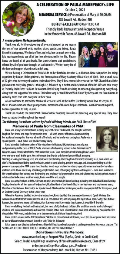 Paula Makepeace By Staff | Sep 19, 2025 Makepeace 3×10.5 (2) NewsletterToday's breaking news and more in your inboxEmail(Required) I'm interested in (please check all that apply)(Required) Daily Newsletter Breaking News Obituaries Are you a paying subscriber to the newspaper?(Required) Yes No Memorials Paula Makepeace Edward A. Dichard, Jr. Barry Joseph Palmer