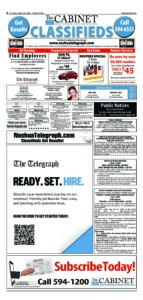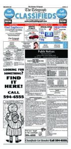 Telegraph Legals 10/19/2025 By Staff | Oct 17, 2025 T101825-B11 NewsletterToday's breaking news and more in your inboxEmail(Required) I'm interested in (please check all that apply)(Required) Daily Newsletter Breaking News Obituaries Are you a paying subscriber to the newspaper?(Required) Yes No Public Notice Cabinet Legals & Classifieds 3/26/2026 Telegraph Legals & Classifieds 3/29/2026 Cabinet Legals & Classifieds 3/19/2026
