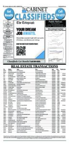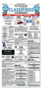 Cabinet Legals & Classifieds 2/12/2026 By Staff | Feb 12, 2026 C021226-A06 NewsletterToday's breaking news and more in your inboxEmail(Required) I'm interested in (please check all that apply)(Required) Daily Newsletter Breaking News Obituaries Are you a paying subscriber to the newspaper?(Required) Yes No Public Notice Telegraph Legals & Classifieds 3/1/2026 Cabinet Legals & Classifieds 2/26/2026 Telegraph Legals & Classifieds 2/22/2026