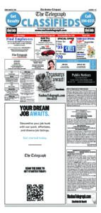 Telegraph Legals & Classifieds 3/8/2026 By Staff | Mar 5, 2026 T030726-B07 NewsletterToday's breaking news and more in your inboxEmail(Required) I'm interested in (please check all that apply)(Required) Daily Newsletter Breaking News Obituaries Are you a paying subscriber to the newspaper?(Required) Yes No Public Notice Cabinet Legals & Classifieds 3/19/2026 Telegraph Legals & Classifieds 3/22/2026 Telegraph Legals & Classifieds 3/15/2026