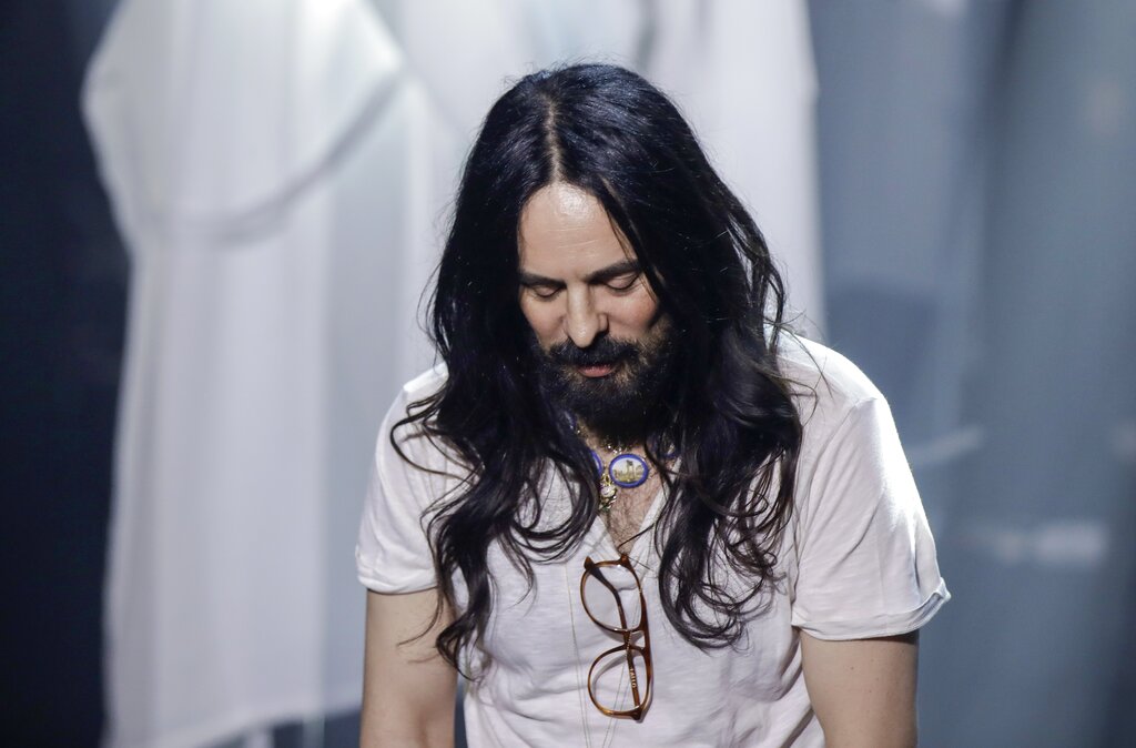 FILE - In this Wednesday, Feb. 19, 2020 file photo, Alessandro Michele acknowledges the applause of the audience at the end of Gucci's Fall/Winter 2020/2021 collection, presented in Milan, Italy. Gucci creative director Alessandro Michele is celebrating the fashion house’s 100-year anniversary, giving historic sweep to a collection unveiled virtually Thursday that embraced its equestrian heritage, borrowed references from the Tom Ford-era and outright stole from a sister brand Balenciaga. (AP Photo/Luca Bruno, File)