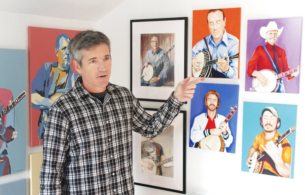 Friendsville, Tenn., resident Colyn Brown talks about the banjo player paintings he is turning into trading cards. The 42-piece set will include banjo players like J.D. Crowe, Ralph Stanley, Earl Scruggs, Mike Scott, Terry Baucom, Bill Emerson, Alison Brown and Don Reno. Ten artists have created the portraits. (Tom Sherlin/The Daily Times via AP)