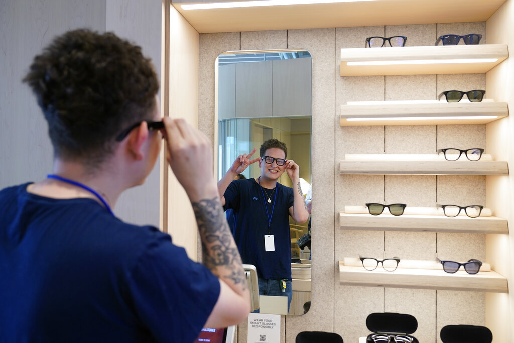 Meta experience expert Askia Luna demonstrates the Ray Ban Stories smart glasses during a preview of the Meta Store in Burlingame, Calif., Wednesday, May 4, 2022. (AP Photo/Eric Risberg)