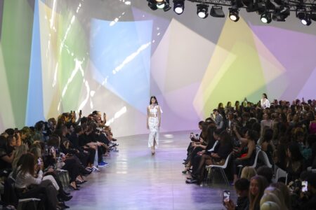 The lone pulsating crystal that glowed color from the center of the runway established the collection’s key idea: Simplicity is powerful.
